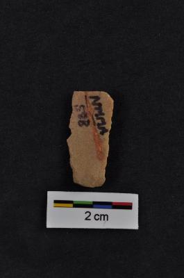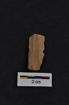 | Description / विवरण | Blade, parallel sided, diffused bulb with striking platform at proximal end, two vertical ridges on dorsal surface, use-ware marks on both working edges. |