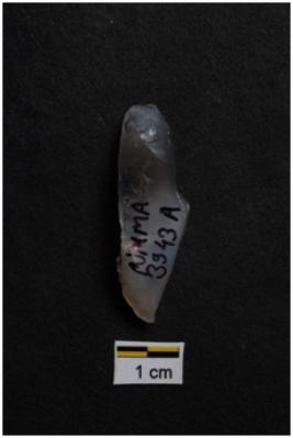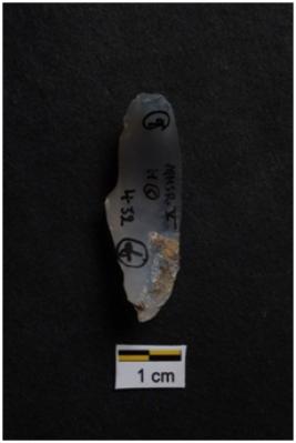 | Description / विवरण | Blade, prominent bulb with striking platform at proximal end, use-ware marks on both working edges. |