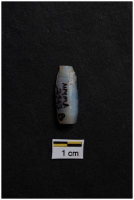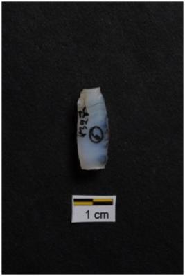 | Description / विवरण | Blade, prominent bulb with striking platform at proximal end, a ridge on dorsal surface, use-ware marks on both working edges. |