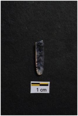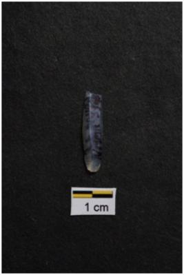 | Description / विवरण | Blade, parallel sided, prominent bulb with striking platform at proximal end, a ridge on dorsal surface, use-ware marks on both working edges. |