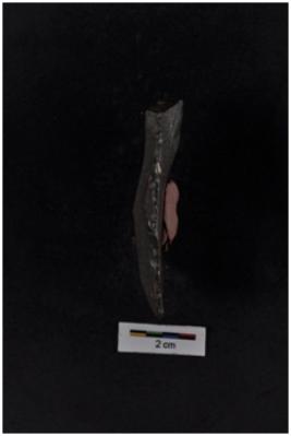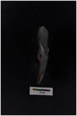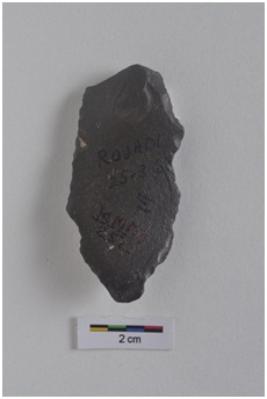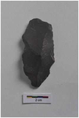 | Description / विवरण | Flake tool, diffused bulb with striking platform visible, a ridge and three flake scars on dorsal surface, retouches on both working edges. |