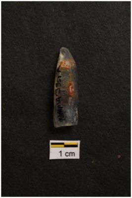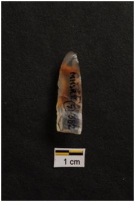 | Description / विवरण | Blade, parallel sided, tapering proximal end, prominent bulb with striking platform at proximal end, a vertical ridge on dorsal surface, use-ware marks on both working edges. |