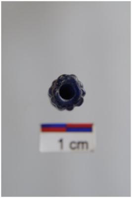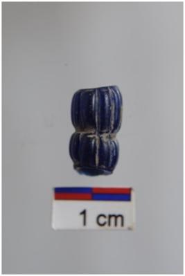 | Description / विवरण | A glass bead, segmented & gadrooned bead of ultramarine glass, mauled, one end is broken. |