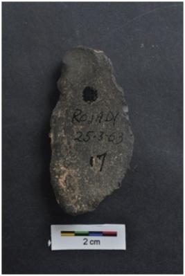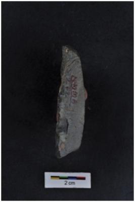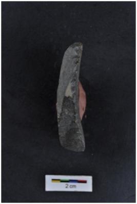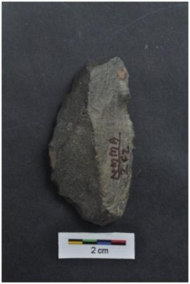 | Description / विवरण | Flake, one convex and another straight edges, a vertical ridge on dorsal surface, diffused bulb with striking platform at proximal end. |