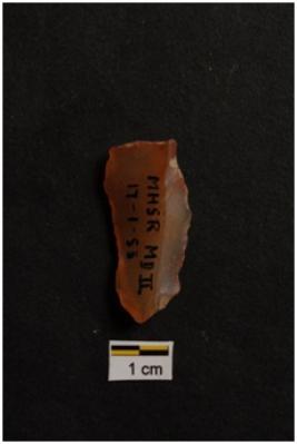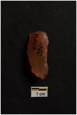 | Description / विवरण | Utilized Flake, prominent bulb on ventral surface, a ridge on dorsal surface, retouches on edges. |