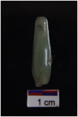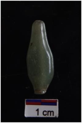 | Description / विवरण | A glass bead, elongated biconical bulbous out line shape, square cross section, green colour, smooth surface. |