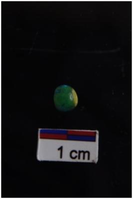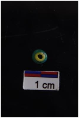 | Description / विवरण | A round glass bead with Short cylindrical yellow matrix inside, covered by green. |