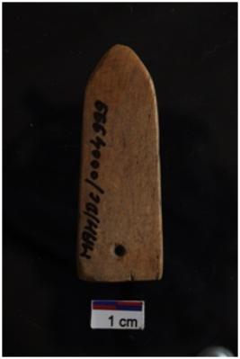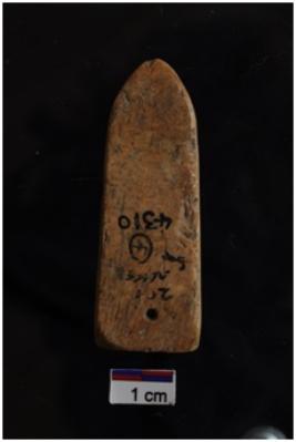 | Description / विवरण | A bone pendent, leaf shape, 2 perforation, smooth surface. |