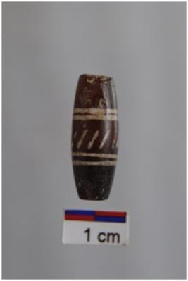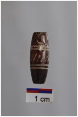 | Description / विवरण | A carnelian bead, barrel shape with circular cross section, round and cross band design on surface, fine polished. |