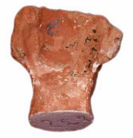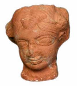 | Description / विवरण | A head of male terracotta figure with combed curly hair tied with a simple head dress and a beaded circular jewel without tassels. A leafy shaped design is seen on the forehead. Depiction of oval shaped face with diamond shaped eyes and slightly bulged eye balls, long broad snubbed nose, thick lips, suggests the Roman influence. |