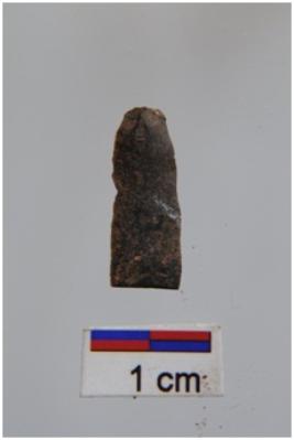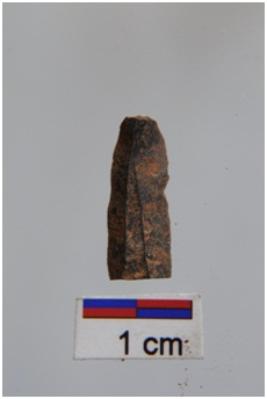| Description / विवरण | Blade, diffused bulb with striking platform at proximal end, two ridges on dorsal surface, use-ware marks on both working edges. |