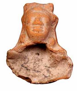 | Description / विवरण | A head of male terracotta figure with combed curly hair tied with a simple head dress and a beaded circular jewel without tassels. A leafy shaped design is seen on the forehead. Depiction of oval shaped face with diamond shaped eyes and slightly bulged eye balls, long broad snubbed nose, thick lips, suggests the Roman influence. |