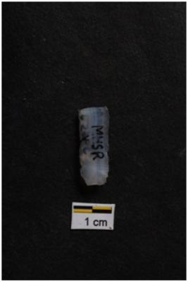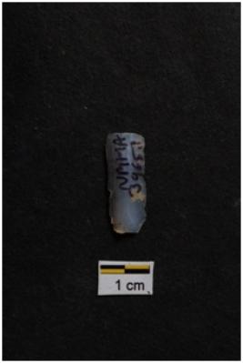 | Description / विवरण | Blade, prominent bulb with striking platform at proximal end, use-ware marks on both working edges. |