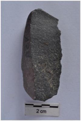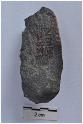 | Description / विवरण | Blade, diffused bulb with striking platform at proximal end, cortex visible on dorsal surface. |