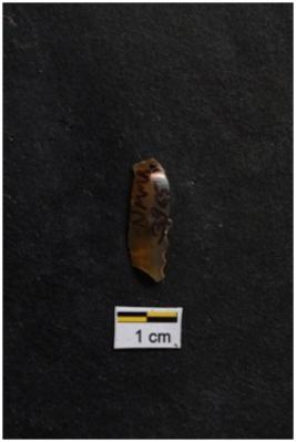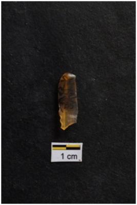 | Description / विवरण | Blade, prominent bulb with striking platform at proximal end, use-ware marks on both working edges. |