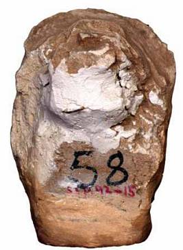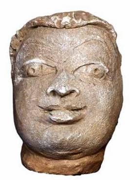 | Description / विवरण | Stucco of a male head with a turban like head dress. Wide forehead, almond shaped eyes with round pinched eye balls, nose flat with wide nostrils. Mouth open with tongue hanging down, thin lower lip, slightly round face, smiling look, flat cheeks and thick chin. |