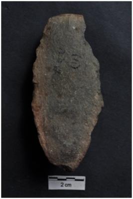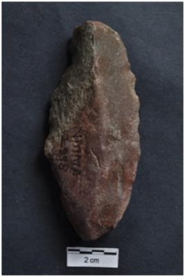 | Description / विवरण | Utilized flake, diffused bulb with striking platform at proximal end, convex working edges with use-ware marks, cortex visible on dorsal surface. |