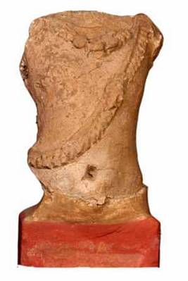 | Description / विवरण | A partly broken tortso of a male figurine, wears a heavy jeweled necklace with a pendent, kanta, a twisted broad yajnopavita with a pendent in the centre. Anga vastra is seen prominently. Flat belly with prominent nave, slightly curved waist. Hands broken. |