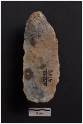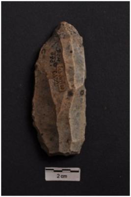 | Description / विवरण | Blade, diffused bulb with striking platform at proximal end, irregular ridges on dorsal surface, use-ware marks on both working edges. |