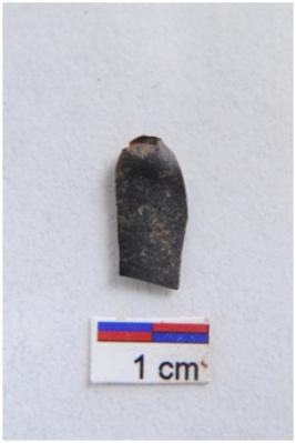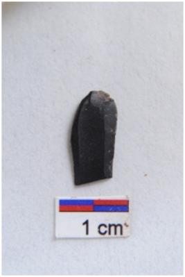 | Description / विवरण | Blade, prominent bulb with striking platform at proximal end, two ridges on dorsal surface, use-ware marks on both working edges. |