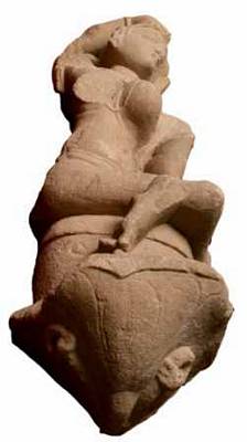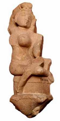 | Description / विवरण | Side view of Madanika sitting probably under a tree broken bending her buck backwards. She is shown seated on a circular pedestal with conical flower shaped base. Her right hand is lifted upwards and placed over her head, left hand broken Torso is lean, with heavy round breasts. right one broken and wears a lower garment tied to the loin by a katisutra. She is shown with long pointed nose, thin lips, oval face, pointed chin, almond shaped eyes partly closed. |
