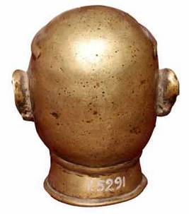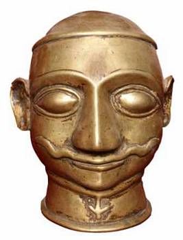 | Description / विवरण | A brass head of human with oval face and diamond shaped eyes with slightly projected eye balls, long broad nose, thin lips, wide mouth, prominent moustache horizontally extended on either side. He wears a tight neck band with a anchor shaped central pendent. |