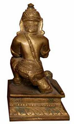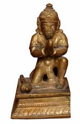| Description / विवरण | A bronze icon of Hanuman on a square pitha decorated with lotus petals. He is shown kneeling posture with left folded leg backwards and knee rested on pitha and the right leg folded and placed on the pitha. He is in anjalimudra. He is shown with long tail raised upwards and kept close to his back. Mace is shown placed on his right side on the pitha. He wears small kiritamakuta, bhujakiritis, undergarment tied with decorated waist band, the folded tassels are hanging from the waist band to the pitha. |