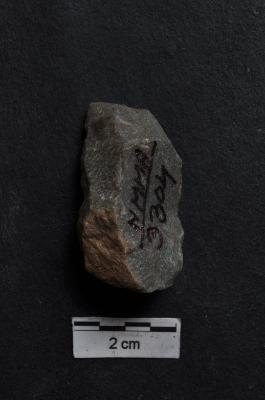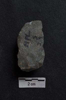 | Description / विवरण | Flake, diffused bulb with striking platform at proximal end, cortex visible on dorsal surface |
