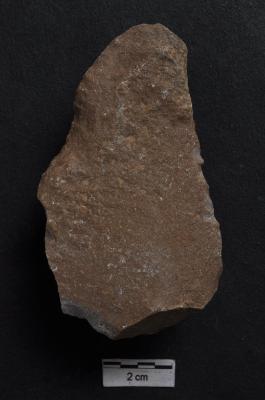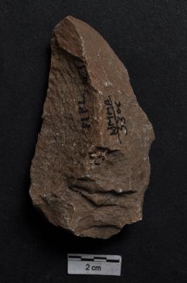 | Description / विवरण | Flake with pointed distal end, prominent bulb with striking platform at proximal end, a ridge dorsal surface. |