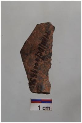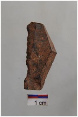| Description / विवरण | Blade with one working edge, prominent bulb with striking platform at proximal end, retouches on one working edge. |