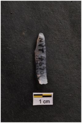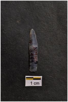 | Description / विवरण | Blade, prominent bulb with striking platform at proximal end, a ridge on dorsal surface, use-ware marks on both working edges. |