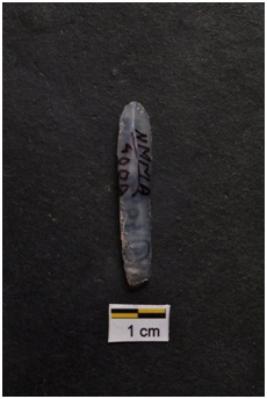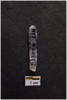 | Description / विवरण | Blade, parallel sided, prominent bulb with striking platform at proximal end, a ridge on dorsal surface, use-ware marks on both working edges. |