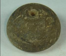 | Description / विवरण | Small terracotta bead with betel nut body and flat base. It has perforated hole in centre and surrounded with striation marks. It is semi fine and has a depression at base. |