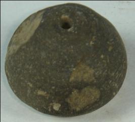 | Description / विवरण | Simple betel nut terracotta bead with perforated hole and part of body is flaked off. |