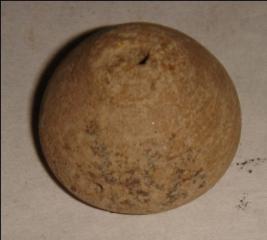 | Description / विवरण | Small terracotta bead with betel nut body and flat base. It has perforated hole in centre and surrounded with striation marks. It is semi fine and has a depression at base. |