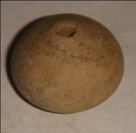 | Description / विवरण | Small terracotta bead with betel nut body and flat base. It has perforated hole in centre and surrounded with striation marks. It is semi fine and has a depression at base. |