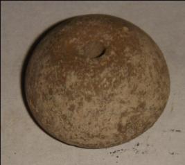 | Description / विवरण | Small terracotta bead with betel nut body and flat base. It has perforated hole in centre and surrounded with striation marks. It is semi fine and has a depression at base.. The body is slightly rubbed off. |