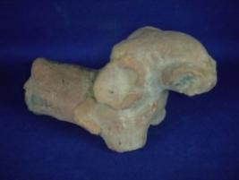 | Description / विवरण | Terracotta animal figurine whose eyes and ears are prominent, limbs are partly missing. There may be a rider over it, only legs of whose is visible. On the basis of the carves, the figurine can be identified as an elephant but from the face part it resembles a ram. |