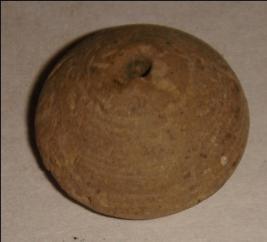 | Description / विवरण | Small terracotta bead with betel nut body and flat base. It has perforated hole in centre and surrounded with striation marks. It is semi fine and has a depression at base. |