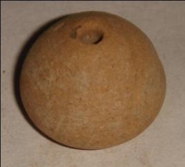 | Description / विवरण | Small terracotta bead with betel nut body and flat base. It has perforated hole in centre and surrounded with striation marks. It is semi fine and has a depression at base. It is crudely finished. |