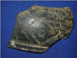 | Description / विवरण | Fragment of rim, its black and red ware, both sides are black, the outer surface is decorated with square blocks of white lines. It is probably portion of neck and rim. |