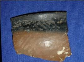 | Description / विवरण | Black and red ware potsherd of an averted rim with body having some diagonal lines on outer surface while inner side is plain black in colour. |