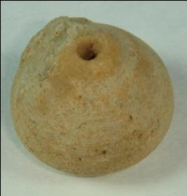 | Description / विवरण | Small terracotta bead with betel nut body and flat base. It has perforated hole in centre and surrounded with striation marks. It is semi fine and has a depression at base. The body is slightly rubbed off. |
