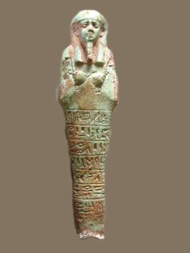 | Description / विवरण | A Shabti with crossed arms, tripartite wig and fake beard. The left hand holds a pick and the right hand holds a hoe and rope for a rectangular bag with crossed fibers, suspended behind the left shoulder. |