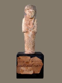 | Description / विवरण | A Shabti with cross armed and tripartite wig over the head, is shown with a band over the head. |