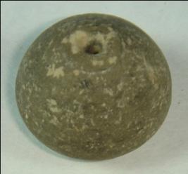 | Description / विवरण | Small terracotta bead with betel nut body and flat base. It has perforated hole in centre and surrounded with striation marks. It is semi fine and has a depression at base. The body is slightly rubbed off. |