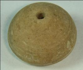 | Description / विवरण | Small terracotta bead with betel nut body and flat base. It has perforated hole in centre and surrounded with striation marks. It is semi fine and has a depression at base. |