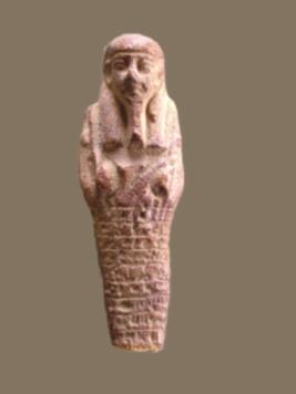 | Description / विवरण | The figure is a miniature mummy-form appearance, plain tripartite wig and a plain beard. Both arms are crossed over the chest but only hands are visible. It has an inscribed pillar. Nine lines of text are incised but the text is damaged. |
