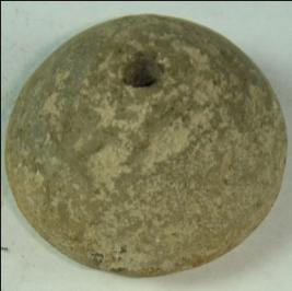 | Description / विवरण | Small terracotta bead with betel nut body and flat base. It has perforated hole in centre and surrounded with striation marks. It is semi fine and has a depression at base. The body is slightly rubbed off. |