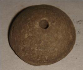 | Description / विवरण | Small terracotta bead with betel nut body and flat base. It has perforated hole in centre and surrounded with striation marks. It is semi fine and has a depression at base. The body is slightly rubbed off. It is crudely finished and hand made. |
